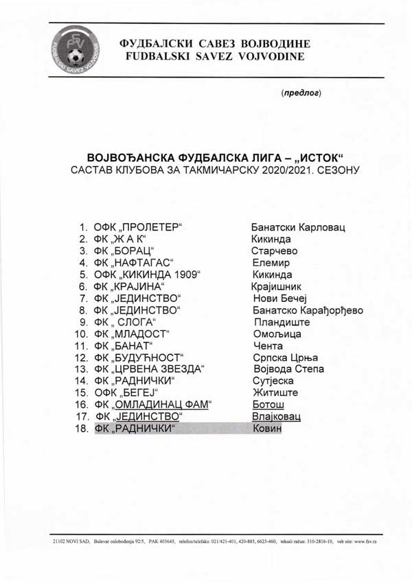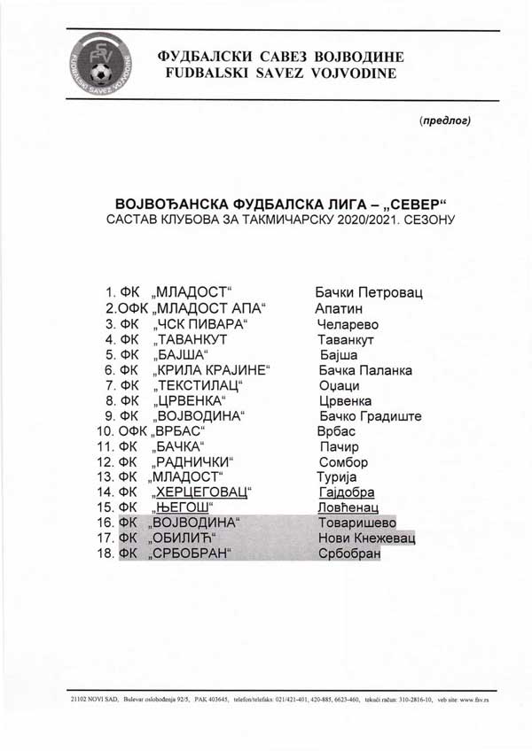 Na toj sednici su konačno formirane liste klubova učesnika za sezonu pred nama 2020/21.godinu. Kako smo već objavili poznati su učesnici u Srpskoj fudbalskoj ligi grupa Vojvodina (20 klubova), Vojvođanskoj fudbalskoj ligi (VFL) grupa Jug (18 klubova), a danas Vam donosimo i ko će sačinjavati VFK, grupa Sever i Istok.